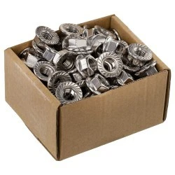 Nakrętka o wymiarze otworu M10, z kołnierzem z nacinaniem zapewniającym skuteczniejsze mocowanie elementów montażowych paneli fotowoltaicznych. Wykonana ze stali nierdzewnej A2, zgodnie z normą DIN 6923.