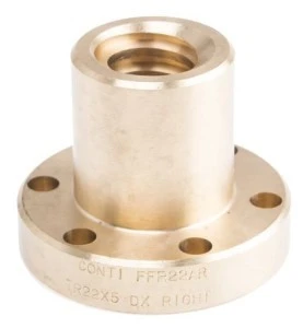 Brązowa nakrętka z kołnierzem. Nakrętka z kołnierzem na pojedynczy początek, śruby z łbem trapezoidalnym. Wykonane z brązu o dobrej odporności na zużycie i przeznaczone do pracy w ruchu ciągłym.