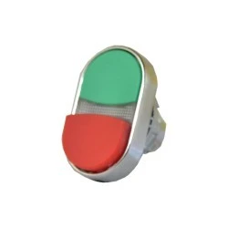 Napęd przycisku podwójnego, powrotnego serii CM. Korpus metalowy. Guziki zielony kryty, czerwony wystający. Możliwość podświetlenia.