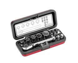 Pudełko na klucze nasadowe, 16-częściowe, w wytrzymałej aluminiowej walizce. Wkładki sześciokątne i kwadratowe do kluczy nasadowych, adapter do mocowania wkładek do kluczy nasadowych, wykonane ze stali chromowo-wanadowej, polerowane chromowane. Zakres dostawy: Mini grzechotka dwukierunkowa z napędem sześciokątnym, adapter 1/4'' do mocowania nasadek, klucze nasadowe 7 - 8 - 10 - 11 - 13 mm, po jednej końcówce 1/4'' o długości 25 mm: do śrub z rowkiem 3 - 5 - 6 mm, do śrub krzyżakowych PH 1 - PH 2 - PH 3, do nasadek sześciokątnych 3 - 4 - 5 mm.