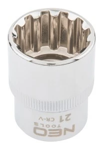 Nasadka Spline 1/2"" NEO (nr ref. 08-593) o rozmiarze 21 mm, wykonana z wytrzymałej stali chromowo-wanadowej zgodnie z normą DIN 3124. Sferyczny kształt nasadki daje bardzo szerokie jej zastosowanie, umożliwiając odkręcanie śrub torx, spline, 12-kątnych, metrycznych, calowych i kwadratowych. Jakość narzędzia potwierdzona certyfikatem TUV i 25-letnią gwarancją producenta. Marka NEO spełnia oczekiwania profesjonalistów.