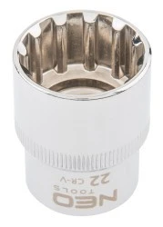Nasadka Spline 1/2"" NEO (nr ref. 08-594) o rozmiarze 22 mm, wykonana z wytrzymałej stali chromowo-wanadowej zgodnie z normą DIN 3124. Sferyczny kształt nasadki daje bardzo szerokie jej zastosowanie, umożliwiając odkręcanie śrub torx, spline, 12-kątnych, metrycznych, calowych i kwadratowych. Jakość narzędzia potwierdzona certyfikatem TUV i 25-letnią gwarancją producenta. Marka NEO spełnia oczekiwania profesjonalistów.