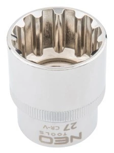 Nasadka Spline 1/2"" NEO (nr ref. 08-597) o rozmiarze 27 mm, wykonana z wytrzymałej stali chromowo-wanadowej zgodnie z normą DIN 3124. Sferyczny kształt nasadki daje bardzo szerokie jej zastosowanie, umożliwiając odkręcanie śrub torx, spline, 12-kątnych, metrycznych, calowych i kwadratowych. Jakość narzędzia potwierdzona certyfikatem TUV i 25-letnią gwarancją producenta. Marka NEO spełnia oczekiwania profesjonalistów.