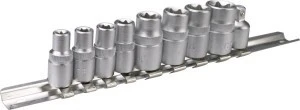 Nasadki Torx 1/4 cala, 3/8 cala, zestaw 9 szt., rozmiary 1/4 cala : E5, E6, E7, E8, rozmiary 3/8 cala: E10, E12, E14, E16, redukcja 3/8 calaF x 1/4 calaM, stal CrV