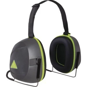 Nauszniki przeciwhałasowe przeznaczone do noszenia na karku. Tekstylny pasek podtrzymujący. Uchwyt metaliczny i czasze z ABS wyściełane pianką syntetyczną.