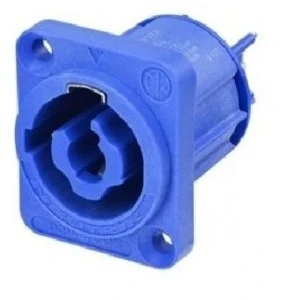 Oryginalne wejściowe złącze zasilajace PowerCON w kolorze niebieskim, przeznaczone do połączeń jednofazowych w stałych i mobilnych instalacjach zasilających 230V.