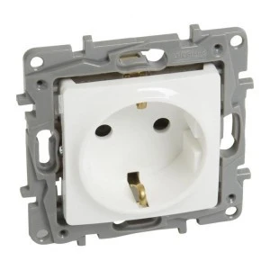Gniazdo pojedyncze schuko niloe wyposażone w przesłony torów w kolorze białym z możliwością łączenia z ramką w jednym z kilku dostępnych kolorów. Produkt trwały, łatwy w montażu, przystępny cenowo.