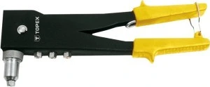 Nitownica TOPEX (nr ref. 43E712) do nitów aluminiowych o średnicy 2.4, 3.2, 4.0, 4.8 mm. Głowica dwupołożeniowa umożliwiająca nitowanie w miejscach trudno dostepnych. Solidna stalowa rękojeść górna i korpus nitownicy. Wydłużony przód głowicy ułatwia nitowanie w miejscach trudno dostępnych. Wygodne uchwyty, z pierścieniem blokującym ułatwiającym przechowywanie. Marka TOPEX skierowana jest do majsterkowiczów.