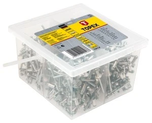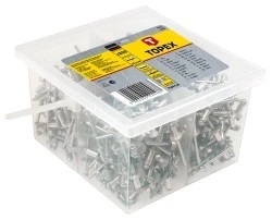 Nity aluminiowe TOPEX (nr ref. 43E405) o wymiarach 4.0 x 10 mm. W opakowaniu 800 sztuk. Nity z łbem kulistym - pełne, do zakuwania. Ten typ nitów zapewnia wyjątkowo mocne połączenie szerokiej gamy elementów, jak blachy, drewno, tworzywa, skóry itp. Nit po zamocowaniu w otworze zakuwa się od strony końca trzpienia, tworząc stałe, odporne na poluzowanie połączenie. Marka TOPEX skierowana jest do majsterkowiczów.