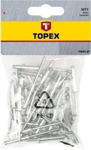 Nity aluminiowe TOPEX (nr ref. 43E502) o wymiarach 4.8 x 10 mm. W opakowaniu 50 sztuk. Nity z łbem kulistym - pełne, do zakuwania. Ten typ nitów zapewnia wyjątkowo mocne połączenie szerokiej gamy elementów, jak blachy, drewno, tworzywa, skóry itp. Nit po zamocowaniu w otworze zakuwa się od strony końca trzpienia, tworząc stałe, odporne na poluzowanie połączenie. Marka TOPEX skierowana jest do majsterkowiczów.