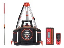 niwelator laserowy, akumulator Li-Ion z ładowarką, detektor precyzyjny z uchwytem do łaty, pilot, okulary, tarczka celownicza, instrukcja obsługi, walizka transportowa