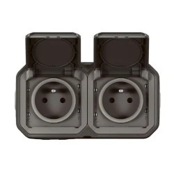 Wodoodporne podwójne gniazdo natynkowe Plexo może być używane do podłączania sprzętu elektrycznego lub elektronicznego w dowolnym miejscu, w którym wymagana jest odporność na wodę, kurz i uderzenia. Do użytku wewnątrz i na zewnątrz budynków. Kolor antracyt.
