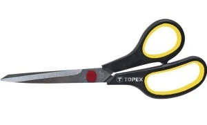Nożyczki TOPEX (nr ref. 17B714) o długości 140 mm. Ostrza wykonane z wysokiej jakości hartowanej stali nierdzewnej, co zapewnia długą żywotność narzędzia. Gumowane uchwyty sprawiają, że nożyczki dobrze leżą w dłoni i nie wyślizgują się, co podnosi komfort pracy. Marka TOPEX skierowana jest do majsterkowiczów.