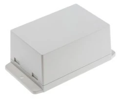 Obudowa z kołnierzem RS. Obudowa kołnierzowa jest wykonana z odpornego na uderzenia tworzywa ABS i jest dostępna w kolorze czarnym lub białym. Posiada podstawę kołnierzową z otworami do montażu na ścianie, osłonę zatrzaskową i łatwe do przecięcia gniazda kablowe w pokrywie. Charakterystyka i zalety. Zatrzaskowa pokrywa ułatwia montaż Podstawa z kołnierzem z otworami ułatwiającymi montaż Gniazda kabli w pokrywie można łatwo obciąć Układ ABS o silnych zderzeniach UL94-HB stopień zapalności Dostępny w kolorze czarnym (podobny do RAL 9005) lub białym (podobny do RAL 9002). Zastosowania. Ta obudowa kołnierzowa jest przeznaczona do przechowywania małych płytek drukowanych (PCB) lub może być używana jako skrzynka do zalewania.