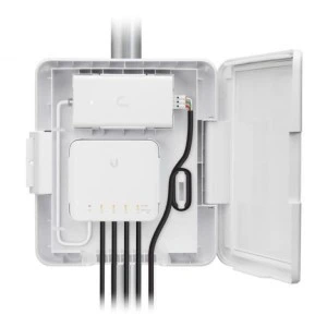 USW-Flex-Utility to odporna na warunki atmosferyczne obudowa zewnętrzna zaprojektowana do użytku z UniFi Switch Flex. Obudowa zawiera kabel połączeniowy Ethernet, a także adapter PoE 60 W zapewniający maksymalny budżet PoE 46 W. USW-Flex-Utility można łatwo zamontować na słupie. Akcesorium gwarantuje bezproblemowe zarządzanie kablami, a dla bezpieczeństwa wyposażone jest w blokadę śrubową.