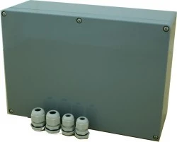 Wymiary: 265 x 185 x 95 [mm] (szer. x wys. x głęb.) Klasa ochrony: IP 65, dławice hermetyczne na wyposażeniu (do montażu, 2szt: 3-6mm + 2szt: 6-12 mm). Materiał: ABS, kolor szary. Zamknięcie: skręcane (x6).