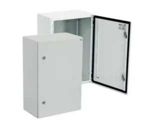 Stalowa obudowa hermetyczna w wykonaniu zamkniętym, przeznaczona do montażu urządzeń elektrycznych i elementów sterowania wewnątrz obiektów przemysłowych; wyposażona w płytę montażową i powłokę z malowania proszkowego w kolorze RAL 7035.