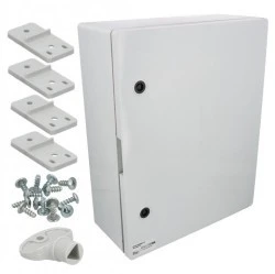 Obudowa wykonana jest z trwałego materiału ABS w kolorze jasnoszarym (RAL 7035). Wyposażona w drzwi na zawiasach zamykane za pomocą dwóch zamków, zapewnia wygodny i bezpieczny dostęp do wnętrza. W zestawie znajduje się także solidna płyta montażowa o grubości 1,20 mm oraz komplet zaczepów umożliwiających łatwy montaż natynkowy.