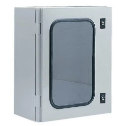 Szafki wykonane są z jasnoszarego (RAL 7035), barwionego w masie, tłoczonego na gorąco, wzmocnionego włóknem szklanym poliestru. Dostępne są gwintowane do mocowania płyty montażowej i ramy montażowej. Szafy ARIA zapewniają optymalne bezpieczeństwo zarówno użytkownikom, jak i urządzeniom, dzięki izolacji ochronnej i wysokiemu stopniowi ochrony do IP66. Szafy ARIA wytrzymują ciągłe temperatury do 70°C (temperatury szczytowe do 130°C). Samogasnące i bezhalogenowe. Znamionowe napięcie izolacji Ui = 1000V. PA541Z Szafa z okienkiem 515x415x230 ARIA, końcówka dwubitowa 3mm, zamknięcie 2-punktowe IP54, IK07