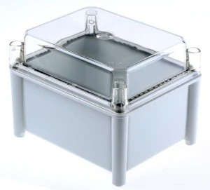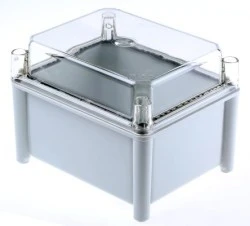 Materiał korpusu = Włókno szklane Długość zewnętrzna = 185 mm Wysokość zewnętrzna = 150 mm Szerokość zewnętrzna = 130 mm Wymiary zewnętrzne = 185 x 130 x 150mm Klasa IP = IP66 Kolor = Szary Kolor pokrywy = Przezroczysta Z kołnierzem = Nie Ekranowane = Nie