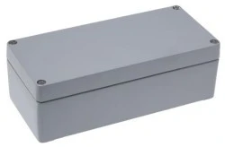 DIN1725, IEC 60529 NEMA 4X i 6P. UL 508A, UL 50, UL 50E. CE MIL-STD-810G (test wibracji mechanicznych i wstrząsów) ASTM B117 IEC 62262 IK 60068-2-75. Obudowa proszkowana RS Pro IP66 z odlewaną aluminium. Od RS Pro, szereg obudów aluminiowych wykonanych ze stopu aluminium marki Die Cast. Obudowy te są przeznaczone do trudnych i wymagających zastosowań, takich jak środowiska zewnętrzne. Obudowy są wodoszczelne i posiadają stopień ochrony IP66, w tym neoprenową uszczelkę o-ring i 4 platerowane miedzią śruby uziemiające. Jest to doskonała obudowa o różnych rozmiarach, spełniająca wymagania klasy IP66, w tym wielu innych standardów i zatwierdzeń. Wszystkie modele cechują się wysoką niezawodnością i doskonałą jakością. Charakterystyka i zalety. Niewodoszczelność Zaprojektowany do trudnych, wymagających zastosowań stop aluminiowy odlew kostny (ALSi12) Punkt mocowania na szynie DIN grubość ścian obudowy wynosi 3 mm Ziemniane proszkowane wykończenie w kolorze szarym. Zawartość zestawu. lid i podstawa obudowy O-ring neoprenowy / uszczelka 4 śruby lid ze stali nierdzewnej 4 x miedziane platerowane wkręty uziemiające. Co to jest obudowa?. Obudowy ogólnego przeznaczenia są skrzynkami ochronnymi, służącymi do przechowywania urządzeń przemysłowych, elektronicznych i innych urządzeń wrażliwych. W zależności od środowiska, mogą być wymagane różne poziomy ochrony. Te specjalne skrzynki Ability obejmują elementy elektryczne montowane na szynie DIN (jeśli są zamontowane) i chronią je przed niekorzystnymi warunkami. Ta obudowa nie jest połączona kołnierzami. Co oznacza skrót IP66?. Stopień ochrony IP jest znany jako - naruszenie ochrony lub międzynarodowa rating ochrony. Klasyfikacja jest zdefiniowana przez Międzynarodową Normę EN 60529 (British BS EN 60529:1992, European IEC 60529:1989). Normy określają poziom skuteczności uszczelniania obudów elektrycznych. Norma oznacza stopień ochrony przed ciałami obcymi, jak brud i woda. Klasyfikacja składa się z liter IP, po których następuje 2 cyfry/cyfry (IP 66). Pierwsza cyfra oznacza stopień ochrony przed wnikaniem ciał stałych. Druga cyfra oznacza stopień ochrony urządzenia umieszczonego w obudowie przed wodą. Przykład IP66 = Pierwsza liczba (6) Rozligniów. Przykład IP66 = Druga liczba (6) cieczy