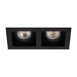 Pierścień oprawy punktowej, Długość [mm]: 185, Szerokość [mm]: 100, Wysokość [mm]: 40, Klasa ochronności przed porażeniem elektrycznym: II/III, Kolor: czarny, Konieczność stosowanie lamp samoekranujących: 1, Materiał obudowy: stop aluminium, Miejsce montażu: do wbudowania w sufit, Miejsce zastosowania: wewnątrz, Minimalna odległość od oświetlanego obiektu: 0,5m, Moc maksymalna [W]: 2 x max 10, Napięcie znamionowe [V]: 12 AC; 12 DC; 220-240 AC, Wielkość otworu montażowego [mm]: 90x170, Regulacja kątowa oprawy oświetleniowej [°]: 20, Regulacja kątowa oprawy oświetleniowej: w jednej osi, Stopień IP: 20, Trzonek: Gx5,3/GU10, Wymienne źródło światła: tak, Wyrób nie nadający się do okrywania materiałem termoizolacyjnym: 1, Zakres temperatury otoczenia, na którą może być narażony wyrób [°C]: 5÷25, Źródło światła: MR16/PAR16, Źródło światła w komplecie: nie.