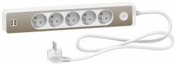 Odace Przedłużacz 5 gniazdowy z łącznikiem 2x USB, 1,5m biały+szczotkowany brąz ST935U1WB