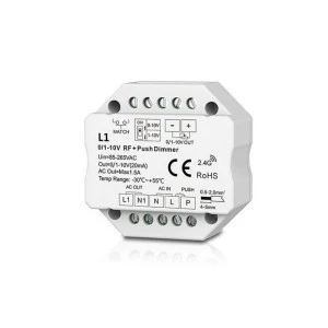 Odbiornik służący do uzyskania kontroli nad instalacją bazujacą na napięciu 0/1-10V (np. ściemniacz 0-10V) z przeznaczeniem do montażu w standardowej puszce fi60. Urządzenie odbiorcze L1 umożliwia dostęp do jednego wyjścia, do którego podłączone oświetlenie może być dowolnie ściemniane oraz rozjaśniane za pomocą za pomocą ściemniacza 0/1-10V. Podstawową formą komunikacji odbiornika L1 jest droga radiowa, umożliwiająca komunikacje w zakresie 30 metrów w terenie otwartym realizowanym poprzez częstotliwość 2,4GHz.