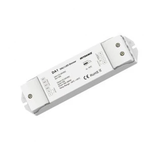 Urządzenie służące do uzyskania kontroli nad monochromatycznym oświetleniem LED posiadającym maksymalny prąd wyjściowy 15A (np. taśma LED jednokolorowa). Sterownik DA1 umożliwia dostęp do jednego wyjścia, do którego podłączone oświetlenie może być dowolnie ściemniane oraz rozjaśniane za pomocą systemu sterowania DALI. Zasadniczą formą komunikacji odbiornika DA1 jest przewodowe podłączenie z główną magistralą opartą o sieć DALI. Sterownik LED został wzbogacony o dodatkowe niezależne wejście na przycisk dzwonkowy umożliwiające ściemnianie/rozjaśnianie przy użyciu przycisku zwiernego. Produkt posiada wbudowany wyświetlacz LCD ukazujący aktualny adres urządzenia.