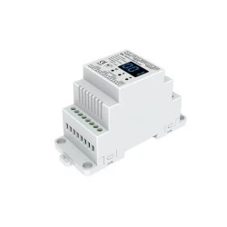 Odbiornik LED DMX512 na szynę DIN - Dekoder DMX to mechanizm odbiorczy posiadający wbudowane cztery kanały, dla których możemy określić cyfrowy adres i uzyskać dostęp do sterowania oświetleniem LED wielokolorowym z dodatkową barwą białą (np. RGB+W). Sterowanie w przypadku dekoderów opartych o system DMX definiuje się jako zmiana jasności, koloru RGB czy temperatury barwowej CCT, gdyż każde wyjście może otrzymać przypisaną cechę do której dostęp będzie finalizowany wykorzystując jego uprzednio ustalony adres. Dekoder DMX512 D4(W) umożliwia zmianę trybu ściemniania pomiędzy liniowym a logarytmicznym przez co w bezproblemowy sposób możemy zmienić charakterystykę wykonywania pracy w zależności od potrzeby. Uzyskanie pożądanego działania nad dekoderem możliwe jest poprzez otrzymanie sygnału cyfrowego DMX512, który jest dekodowany i przetwarzany na sygnał PWM.
