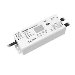 Odbiornik LED DMX512 - Dekoder DMX to mechanizm odbiorczy posiadający wbudowane cztery kanały, dla których możemy określić cyfrowy adres i uzyskać dostęp do sterowania oświetleniem LED wielokolorowym z dodatkową barwą białą (np. RGB+W). Sterowanie w przypadku dekoderów opartych o system DMX definiuje się jako zmiana jasności, koloru RGB czy temperatury barwowej CCT, gdyż każde wyjście może otrzymać przypisaną cechę do której dostęp będzie finalizowany wykorzystując jego uprzednio ustalony adres. Dekoder DMX512 D4-WPS umożliwia zmianę trybu ściemniania pomiędzy liniowym a logarytmicznym przez co w bezproblemowy sposób możemy zmienić charakterystykę wykonywania pracy w zależności od potrzeby. Uzyskanie pożądanego działania nad dekoderem możliwe jest poprzez otrzymanie sygnału cyfrowego DMX512, który jest dekodowany i przetwarzany na sygnał PWM.