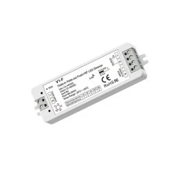 Odbiornik przeznaczony do sterowania oraz kontroli nad monochromatycznym (jednobarwnym) oświetleniem LED (np. taśma LED mono). Elementarną formą komunikacji odbiornika V1-F jest bezprzewodowa droga radiowa, którą łączy się z urządzniem nadawczym takim jak pilot do led bądź panel naścienny led. Dodatkowo urządzenie zostało wyposażone o dodatkowe niezależne wejście bezpotencjałowe umożliwiające sterowanie - ściemnianie/rozjaśnianie przy użyciu przycisku zwiernego. Urządzenie odbiorcze V1-F umożliwia dostęp do jednego wyjścia, do którego podłączone oświetlenie może być dowolnie ściemniane oraz rozjaśniane za pomocą sygnału PWM. Ponadto produkt posiada na obudowie potencjometr, który to umożliwia regulacje czasu załączania i wyłączenia taśmy LED w zakresie od 1 do 20 sekund
