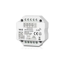 Odbiornik dopuszkowy ( montaż w standardowej puszcze fi60) do sterowania oraz kontroli nad kilkoma instalacjami oświetlenia LED. Dedykowany zarówno do instalacji MONO ( jednokolorowych), ze zmienną temperaturą barwową CCT, wielokolorowych RGB oraz wielokolorowych z dodatkową barwą białą RGB+W. Produkt pozwala na dostęp do czterech wyjść, do którego podłączone zostaje oświetlenie led. Umożliwia to swobodne ściemnianie/rozjaśnianie, sterowanie kolorów w zakresie palety RGB oraz barwy monochromatycznej (białej) za pomocą sygnału PWM. Elementarną formą komunikacji odbiornika V4-S jest bezprzewodowa droga radiowa, którą łączy się z urządzeniem nadawczym takim jak pilot do led bądź panel naścienny led. Poza tym urządzenie odbiorcze V4-S cechuje się zakresem napięcia wejściowego rzędu 12-24V oraz płynną pracą ściemniania PWM.