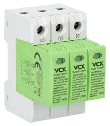 VCXDC B+C 3P 1200V (T1T2) 12,5kA GREEN posiada zintegrowane zabezpieczenie termiczne – nie wymaga dodatkowego dobezpieczenia. W przypadku jego zastosowania rekomenduje się użyć wkładki bezpiecznikowej topikowej 1000VDC / 125A gG lub bezpiecznika 1000VDC / 40A typ C.