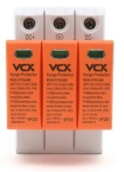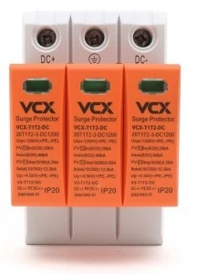 VCXDC B+C 3P 1200V (T1T2) 12,5kA RED posiada zintegrowane zabezpieczenie termiczne – nie wymaga dodatkowego dobezpieczenia. W przypadku jego zastosowania rekomenduje się użyć wkładki bezpiecznikowej topikowej 1000VDC / 125A gG lub bezpiecznika 1000VDC / 40A typ C.