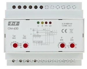 Przekaźnik OM-630 dokonuje ciągłych pomiarów wartości napięć podłączonych do zacisków L1, L2, L3 i N oraz prądów płynących przez wbudowane w przekaźniki prądowe. Na tej podstawie analizuje moc pobieraną przez urządzenia podłączone do linii odbiorczej. W przypadku, gdy moc pobierana przez odbiorniki przekracza wartość zadaną przez użytkownika, to po czasie TON nastąpi odłączenie przekaźnika K1 i odłączenie obciążenia. Po upłynięciu czasu TOFF przekaźnik K1 załączy się ponownie. Jeżeli pobór mocy jest w dalszym ciągu przekroczony, to po czasie TON nastąpi ponowne odłączenie obciążenia. Sekwencja taka może zostać powtórzona 6 razy. Następnie obciążenie zostaje odłączone na 10 min. Po upłynięciu 10 min. przerwy sekwencja rozpoczyna się od początku.