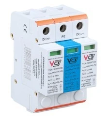 - VCX-40PV-C 1000V klasy T2 wyposażony jest w warystory (MOV) w modułach DC+ i DC– oraz iskiernik gazowy (GDT) w module PE co skutecznie eliminuje problem starzenia się iskiernika pod wpływem tzw. prądu upływu i prądu roboczego Wyposażone są w wizualny wskaźnik działania (zielony – ochrona, czerwony – brak ochrony).