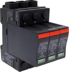 Ogranicznik przepięć do instalacji DC do sieci typu DC/PV. Konstrukcja wtykowa Klasa I+II (T1+T2), liczba biegunów 3. Napięcie znamionowe 1200 V DC. Znamionowy prąd wyładowczy In 25KA, max prąd wyładowczy 80KA, prąd szczytowy Iimp 12,5 kA 10/350. Technologia MOV ze stykiem bezpotencjałowym do zdalnej sygnalizacji uszkodzenia.