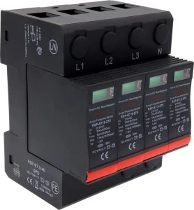 Ogranicznik przepięć do instalacji AC, napięcie znamionowe 230 V AC. Konstrukcja wtykowa Klasa I+ II (T1+T2), liczba biegunów 4. Maks. Prąd wyładowczy Imax 50kA 8/20. Prąd szczytowy 7.5kA 10/350, znamionowy prąd wyładowczy 20 kA. Dla sieci trójazowej „4+0” Uc 275V AC. Technologia MOV ze stykiem bezpotencjałowym do zdalnej sygnalizacji uszkodzenia.