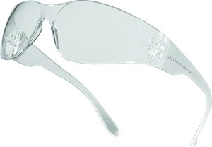 Jednoczęściowe okulary z poliwęglanu. Elastyczne, wygięte i płaskie zauszniki. Nosek z poliwęglanu zintegrowany. Łatwość użytkowania z hełmem budowlanym oraz nausznikami przeciwhałasowymi. Osłony skroni.