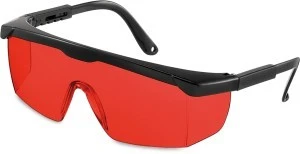 Okulary niemieckiej marki geo-FENNEL do obserwacji czerwonej plamki lub linii lasera, szczególnie przydatne podczas prac pomiarowych w silnie nasłonecznionych pomieszczeniach. Zastosowany w okularach specjalny filtr uwydatnia światło lasera padające na dowolny obiekt.Cechy wyróżniające: czerwony filtr wyróżniający wiązkę lasera z tła (znacznie polepszając jej widoczność w silnie oświetlonych pomieszczeniach), regulowanej długości zauszniki pozwalają dostosować okulary do indywidualnego użytkownika, powierzchnia czerwonego filtru zachodzi na boki przez co zapobiega przedostawaniu się białego światła zewnętrznego.Podstawowe dane techniczne: kolor zastosowanego filtra czerwony, masa okularów 0,03 kg.