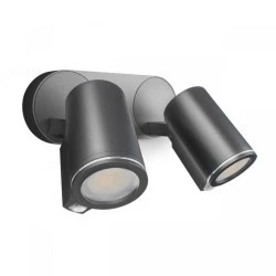 Spot DUO zapewnia doskonałe oświetlenie wokół całego budynku. Wytrzymałe głowice obracają się (180°) i przechylają (90°). Dzięki temu można je ustawić bez wysiłku, kierując światło w wybraną stronę. Naświetlacze wyposażono w czujnik ruchu PIR o kącie detekcji 90° i zasięgu do 10 metrów.