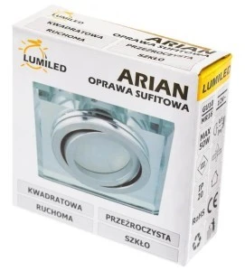 Oprawa Halogenowa z serii ARIAN to szklana Oprawa, która została przystosowana do pracy z żarówkami LED o trzonku MR16 lub GU10. Oprawa sufitowa została wykonana z wysokiej jakości szkła, które pięknie łączy się ze srebrnymi elementami, wykonanymi z aluminium. Szklana Oprawa będzie się cudownie prezentować zarówno w nowoczesnych jak i klasycznych wnętrzach. Ruchoma Oprawa posiada możliwość regulacji kąta świecenia, dzięki czemu pozwala na skierowanie wiązki światła tam, gdzie zachodzi taka potrzeba. Kwadratowa Oprawa o przezroczystej barwie będzie się niesamowicie prezentować na każdym suficie, a połączenie kilku takich opraw pozwoli stworzyć idealny podwieszany sufit.
