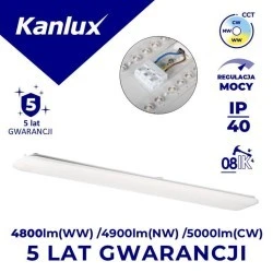 Oprawa liniowa LED, Długość [mm]: 1200, Szerokość [mm]: 168, Wysokość [mm]: 57, Barwa światła: ciepłobiała,biała,chłodnobiała, Częstotliwość znamionowa [Hz]: 50, Ilość cykli wł/wył: ≥20000, Jednolitość barw [SDCM]: 6, Kąt świecenia [°]: 140, Klasa ochronności przed porażeniem elektrycznym: I, Kolor: biały, Materiał klosza: tworzywo sztuczne, Materiał obudowy: stal, Miejsce montażu: do nadbudowania na ścianie,do nadbudowania na suficie, Miejsce zastosowania: wewnątrz, Minimalna odległość od oświetlanego obiektu: 0,5m, Moc maksymalna [W]: 30 / 45, Możliwość współpracy ze ściemniaczem: nie, Napięcie znamionowe [V]: 220-240 AC, Rodzaj diody: LED SMD, Rodzaj przyłącza: kostka samozaciskowa, Stopień IK: 08, Stopień IP: 40, Strumień świetlny oprawy [lm]: max 4800 / 4900 / 5000, Temperatura barwowa [K]: 3000/4000/6500, Trwałość [h]: 30000, Trzonek: solder pads, Współczynnik mocy: 0.97, Współczynnik oddawania barw Ra: 80, Wykrywanie ruchu: nie, Zakres przekrojów stosowanych przewodów [mm2]: 0,5÷2,5, Zakres temperatury otoczenia, na którą może być narażony wyrób [°C]: 5÷25, Zawartość rtęci: nie, Zintegrowane źródło światła LED: 1, Kształt: prostokątny, Zastosowana technologia oświetleniowa: LED, Bezkierunkowe lub kierunkowe źródło światła: NDLS, Źródło światła zasilane lub niezasilane napięciem sieciowym: NMLS, Połączone źródło światła (CLS): nie, Źródło światła z możliwością zmiany barwy światła: nie, Źródło światła o wysokiej luminancji: nie, Osłona przeciwolśnieniowa: nie, Funkcja ściemniania: nie, Zużycie energii w trybie włączenia (kWh/1000h): 22, Użyteczny strumień świetlny źródła światła Φuse [lm]: 3000, Użyteczny strumień świetlny źródła światła Φuse [lm]: w kuli (360°), Moc w trybie włączenia Pon [W]: 21,1, Moc w trybie czuwania (Psb): 0, Wartość wskaźnika oddawania barw R9: 0, Współczynnik zachowania strumienia świetlnego: 0,95, Deklaracja równoważności mocy [W]: 177, Współczynnik trwałości: 0,9, Współrzędne chromatyczności (x): 0.44, Współrzędne chromatyczności (y): 0,403, EPRELID: 2309869, Dodatkowe informacje: Produkt wyposażony (CP), Liczba modułów: 2.