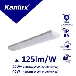 Oprawa liniowa LED, zasilanie 220-240V~;50Hz, moc 22/40W, źródło światła LED SMD (w komplecie),temperatura barwowa: 3000/4000K, strumień świetlny: 2500(WW) 2700(NW)/ 4200(WW) 4400(NW); trwałość 50000h, ilość cykli wł./wył. 30000; kąt świecenia 120°; IP 20, kolor biały.