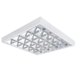 Oprawa rastrowa natynkowa, zasilanie 220-240V~;50/60Hz, moc 4 x 18W, EVG "ciepły start" (w komplecie), źródło światła świetlówka liniowa T8, trzonek G13, IP 20, poprzeczki rastra w kształcie "V", odbłyśnik w kształcie półparaboli, gniazda świetlówek zamaskowane odbłyśnikiem, oprawy przystosowane do zwieszenia na zawiesiach, statecznik marki OSRAM w klasie A2, łatwy montaż rastra na zaczepach sprężynujących, szybkozłączka do podłączenia zasilania, ułatwia i przyśpiesza montaż, kolor biały.