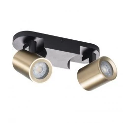 Oprawa ścienno-sufitowa, Długość [mm]: 220, Szerokość [mm]: 70, Wysokość [mm]: 108, Częstotliwość znamionowa [Hz]: 50, Klasa ochronności przed porażeniem elektrycznym: I, Kolor: czarny / złoty, Materiał klosza: stop aluminium, Materiał obudowy: stop aluminium, Miejsce montażu: do nadbudowania na ścianie|do nadbudowania na suficie, Miejsce zastosowania: wewnątrz, Minimalna odległość od oświetlanego obiektu: 0,5m, Moc maksymalna [W]: 2 x max 10, Napięcie znamionowe [V]: 220-240 AC, Oprawa ruchoma w zakresie horyzontalnym [°]: 310, Oprawa ruchoma w zakresie wertykalnym [°]: 90, Regulacja kątowa oprawy oświetleniowej [°]: w dwóch osiach, Rodzaj przyłącza: kostka śrubowa, Stopień IP: 20, Trzonek: GU10, Zakres przekrojów stosowanych przewodów [mm2]: 1÷2,5, Zakres temperatury otoczenia, na którą może być narażony wyrób [°C]: 5÷25, Źródło światła: PAR16, Źródło światła w komplecie: nie, Kształt: okrągły, Liczba punktów światła: 2.
