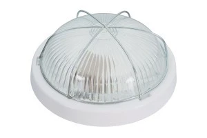 Podstawa oprawy wykonana jest z białego polipropylenu, klosz szklany, koszyk stalowy.