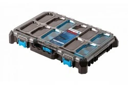 Organizer walizkowy z pokrywą wykonaną z poliwęglanu służy do przechowywania narzędzi budowlanych, warsztatowych itp. Został stworzona z myślą o wymagających użytkownikach. Jest wyposażony w 5 funkcjonalnych kubeczków, które pozwalają na przechowywanie małych narzędzi, akcesoriów i innych przedmiotów. Organizer zapewnia łatwe łączenie z innymi elementami systemu skrzyń modułowych. Wytrzymałe zapięcia z abs oraz metalowe zawiasy zapewniają bezpieczeństwo podczas przewożenia asortymentu. Korpus organizera został wykonany z polimerów. Gwarantuje ochronę przed zalaniem oraz kurzem. Przeznaczony do profesjonalnego użytkowania. Świetnie sprawdza się w wielu branżach takich jak budownictwo, przemysł, motoryzacja czy logistyka.