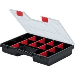 Wygodny i użyteczny pojemnik o wymiarach 390x290x60mm, który można zastosować do przechowywania małych akcesoriów oraz narzędzi. Dzięki ruchomym przegrodom jest bardzo praktyczny i umożliwia segregacje według indywidualnych potrzeb. Sprawdza się idealnie dla przechowywania małych elementów, drobnego osprzętu i różnych materiałów eksploatacyjnych. Solidne przezroczyste wieczko umożliwia szybkie zlokalizowanie szukanego produktu oraz pozwala na oszacowanie ilości znajdujących się wewnątrz elementów bez konieczności jego otwierania. Organizer posiada uchwyt transportowy do łatwego i wygodnego transportu. Wyposażenie znajdujące się na zdjęciach nie jest elementem zestawu.